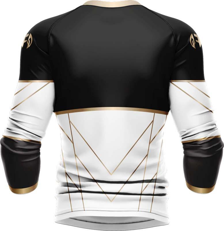The Mighty Morphin White Ranger Long Sleeve Rash Guard features a unique aesthetic that combines elements of superhero lore, Norse and Roman mythology, and Asian cultural motifs. This fusion of styles creates a visually striking garment that not only performs well but also makes a bold statement.